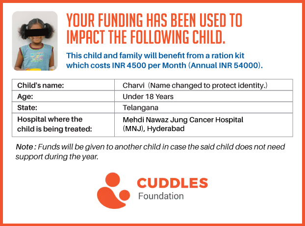 This campaign of mine is being done in partnership with the NGO -Cuddles Foundation and aims to fight hunger and malnutrition in children from low-income homes by giving them a MONTHLY RATION BASKET. This improves their chance of survival by 70% and ultimately does save lives. The baskets are given to children at the Basavatarakam Indo-American Cancer Hospital and MNJ Hospital for Oncology in Hyderabad.