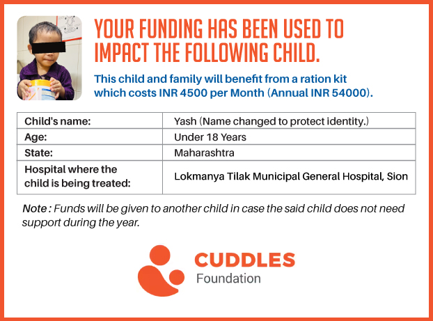 This campaign of mine is being done in partnership with the NGO -Cuddles Foundation and aims to fight hunger and malnutrition in children from low-income homes by giving them a MONTHLY RATION BASKET. This improves their chance of survival by 70% and ultimately does save lives. The baskets are given to children at the Tata Memorial Hospital, BJ Wadia Children's Hospital, Lokmanya Tilak Municipal General Hospital, Nair Hospital, King Edward Memorial Hospital, Comprehensive Thalassemia Care Pediatric Hematology-Oncology BMT Centre, and Society for Rehabilitation of Crippled Children in Mumbai. This costs just INR 4500 per month.