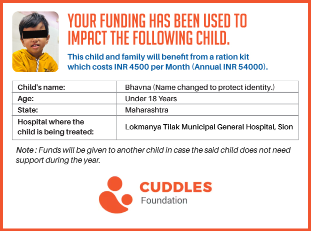 This campaign of mine is being done in partnership with the NGO -Cuddles Foundation and aims to fight hunger and malnutrition in children from low-income homes by giving them a MONTHLY RATION BASKET. This improves their chance of survival by 70% and ultimately does save lives. The baskets are given to children at the Tata Memorial Hospital, BJ Wadia Children's Hospital, Lokmanya Tilak Municipal General Hospital, Nair Hospital, King Edward Memorial Hospital, Comprehensive Thalassemia Care Pediatric Hematology-Oncology BMT Centre, and Society for Rehabilitation of Crippled Children in Mumbai. This costs just INR 4500 per month.