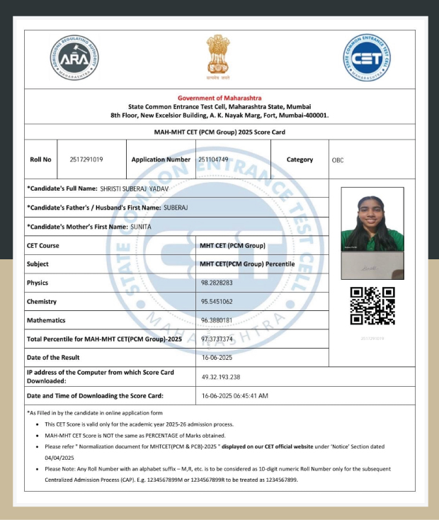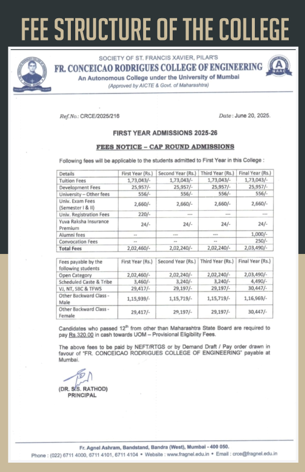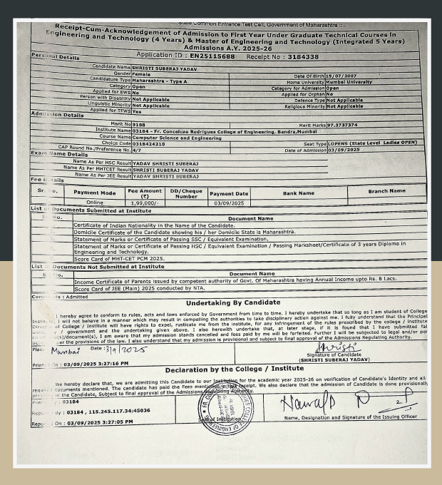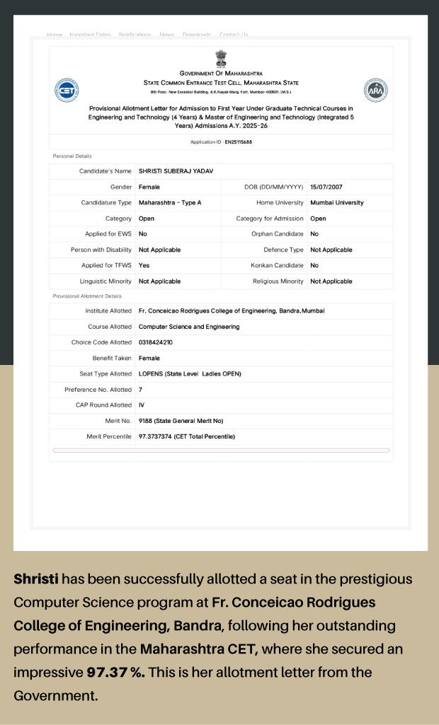 Her determination and resilience paid off when she secured a remarkable 97.37% in the Maharashtra CET, earning her a seat in Computer Science at Fr. Conceicao Rodrigues College of Engineering in Bandra (W). (This is located next to the Taj Lands End hotel.)