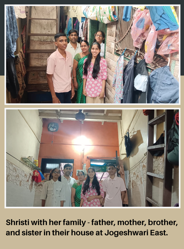 Her father, Suberaj Yadav, comes from a humble farmer family background in Uttar Pradesh and moved to Mumbai in search of work opportunities. He has been working as a driver for the past 15 years in Mumbai, where he built his small family with his wife, who is a homemaker, and 3 children. Despite facing financial constraints, Shristi's family supported her educational aspirations. Her father's hard work and her family's love have been her pillars of strength. Shristi's pursuit of higher education holds the promise of a brighter future for her entire family.