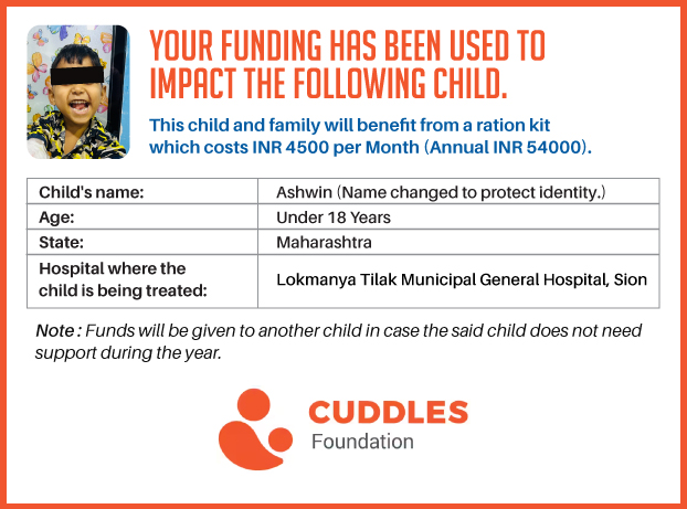 This campaign of mine is being done in partnership with the NGO -Cuddles Foundation and aims to fight hunger and malnutrition in children from low-income homes by giving them a MONTHLY RATION BASKET. This improves their chance of survival by 70% and ultimately does save lives. The baskets are given to children at the Tata Memorial Hospital, BJ Wadia Children's Hospital, Lokmanya Tilak Municipal General Hospital, Nair Hospital, King Edward Memorial Hospital, Comprehensive Thalassemia Care Pediatric Hematology-Oncology BMT Centre, and Society for Rehabilitation of Crippled Children in Mumbai. This costs just INR 4500 per month.