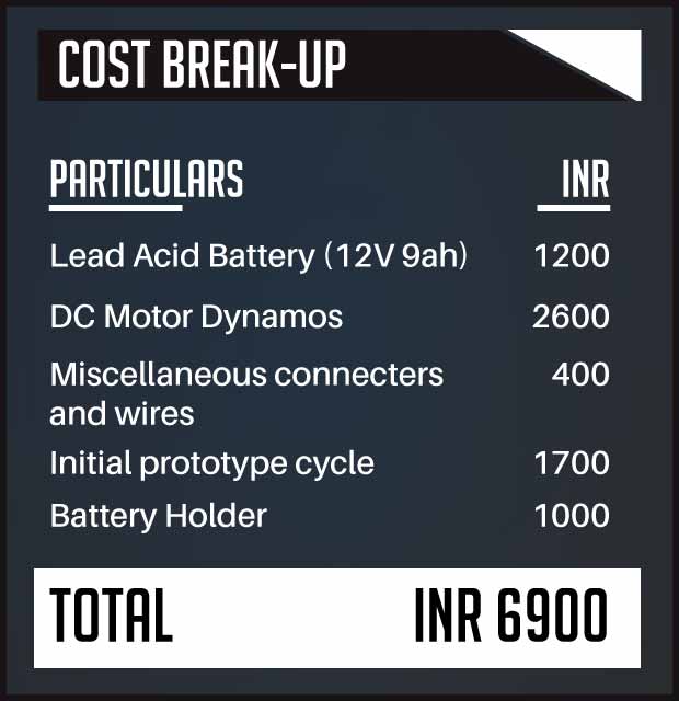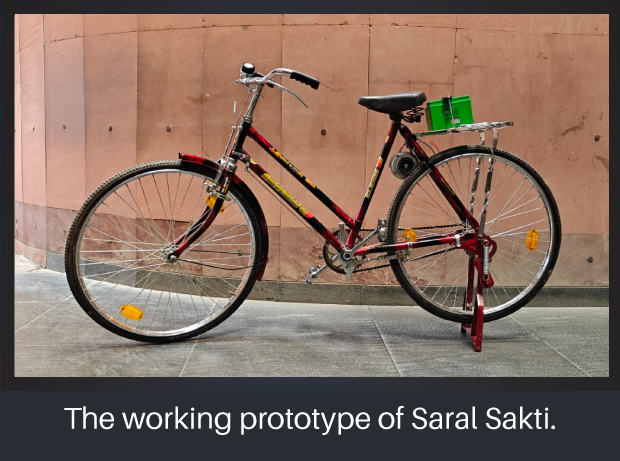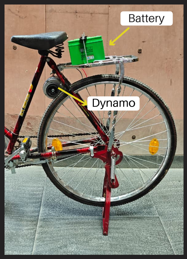 Our pedal-powered cycle inverter generates electricity using a dynamo attached to the wheel, converting mechanical energy into electrical energy. This innovative device can transform the lives of families across UP, Haryana, and Rajasthan for just INR 6900.