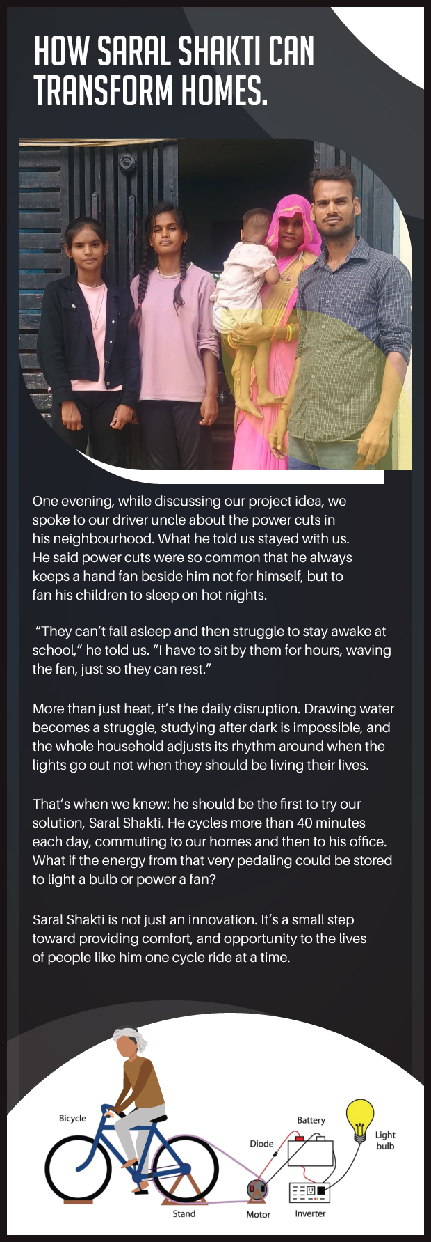 I am driven by a passion to positively impact the world. Homes across UP, Haryana, and Rajasthan face significant challenges due to frequent power interruptions. This severely impacts their day-to-day activities. To address this issue, we have developed a simple and affordable solution.