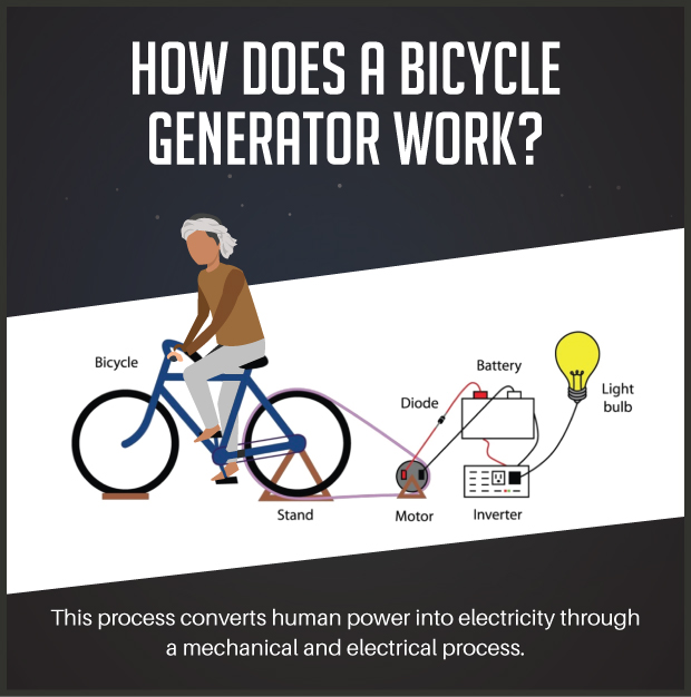The concept is simple - Pedaling to generate electricity involves a system where human mechanical energy from pedaling is converted into electrical energy by a dynamo or alternator, and this electricity is then stored in a battery to power devices.