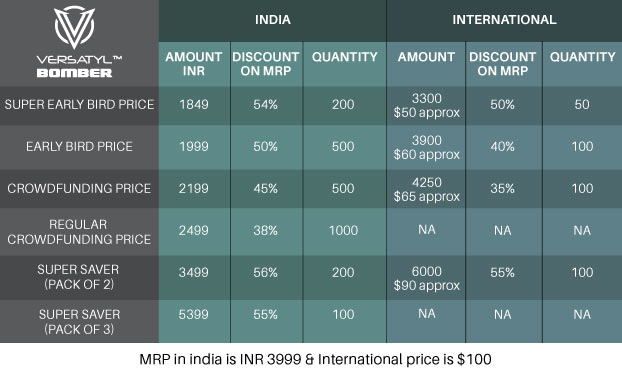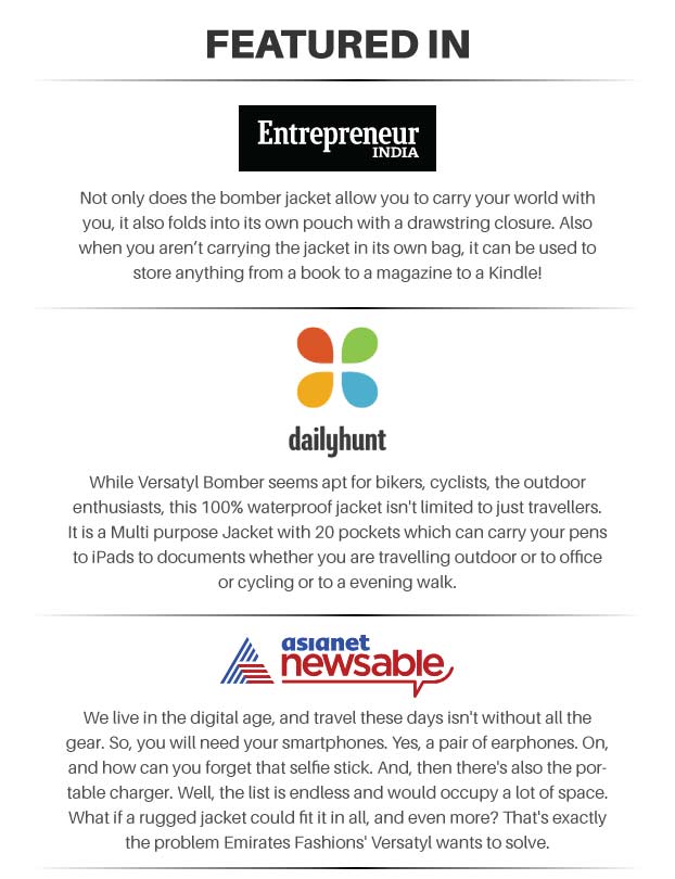 Emirate Fashions Pvt Ltd has a long history in clothing manufacturing and has been making garments for a few of the reputed brands in India. The VERSATYL BOMBER jacket is the result of massive demand that we've been observing from travellers, bikers, cyclists & the outdoor person. Rather than come up with another Jacket, we decided to give "people on the move" a piece of clothing that gave them the freedom to carry all their essentials around on their person and make it 100% water and windproof! We're launching this campaign on fueladream.com to make it easier to reach out to our customers globally!