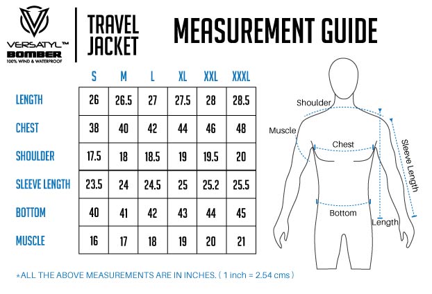 Jackets are usually worn on one or two layers of clothing. In addition the VERSATYL BOMBER can pack quite a lot of travel stuff making it bulk up a bit. The last thing you want is a super tight fit. Ordering ONE or TWO sizes bigger is what we would recommend. The final call is yours.