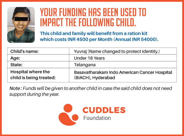 This campaign of mine is being done in partnership with the NGO -Cuddles Foundation and aims to fight hunger and malnutrition in children from low-income homes by giving them a MONTHLY RATION BASKET. This improves their chance of survival by 70% and ultimately does save lives. The baskets are given to children at the Basavatarakam Indo-American Cancer Hospital and MNJ Hospital for Oncology in Hyderabad.
