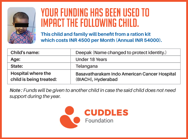 This campaign of mine is being done in partnership with the NGO -Cuddles Foundation and aims to fight hunger and malnutrition in children from low-income homes by giving them a MONTHLY RATION BASKET. This improves their chance of survival by 70% and ultimately does save lives. The baskets are given to children at the Basavatarakam Indo-American Cancer Hospital and MNJ Hospital for Oncology in Hyderabad.