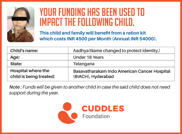 This campaign of mine is being done in partnership with the NGO -Cuddles Foundation and aims to fight hunger and malnutrition in children from low-income homes by giving them a MONTHLY RATION BASKET. This improves their chance of survival by 70% and ultimately does save lives. The baskets are given to children at the Basavatarakam Indo-American Cancer Hospital and MNJ Hospital for Oncology in Hyderabad.
