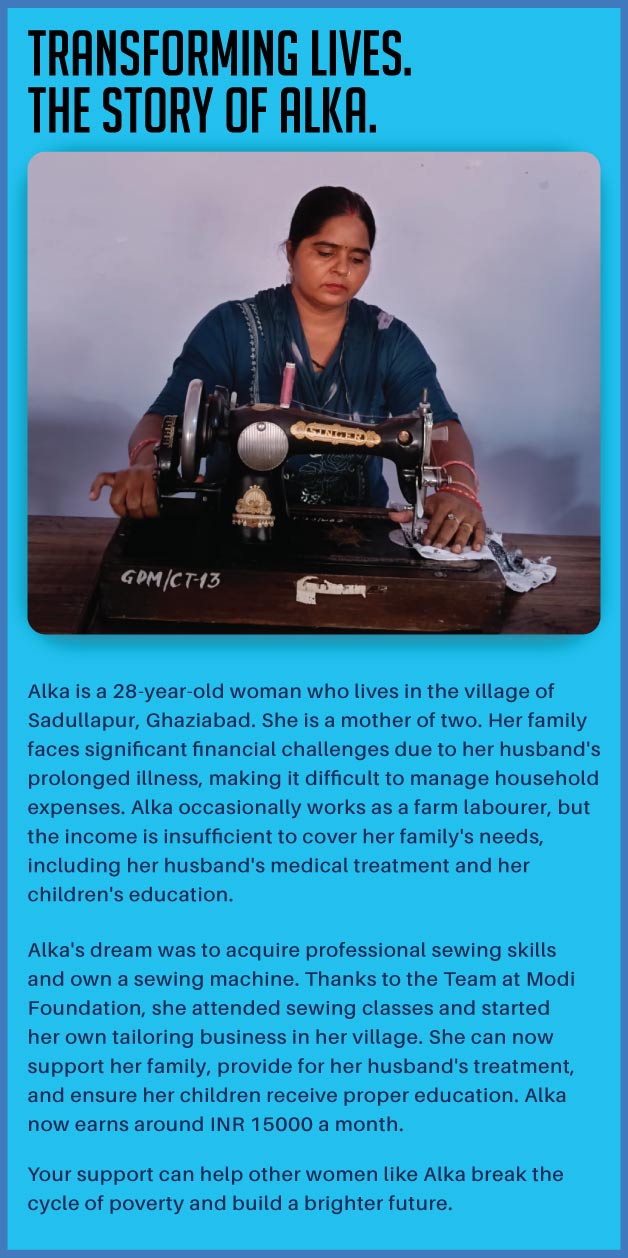 In Modinagar, Uttar Pradesh (30 km from Ghaziabad), many women face an uncertain future due to low household incomes and limited employment opportunities. This severely impacts economically poor families. Despite their eagerness to work and contribute to household income, these women struggle to make ends meet. Thousands of such women need assistance to acquire skills, earn a livelihood, and enhance their earnings, breaking the cycle of poverty and securing a brighter future for their families.