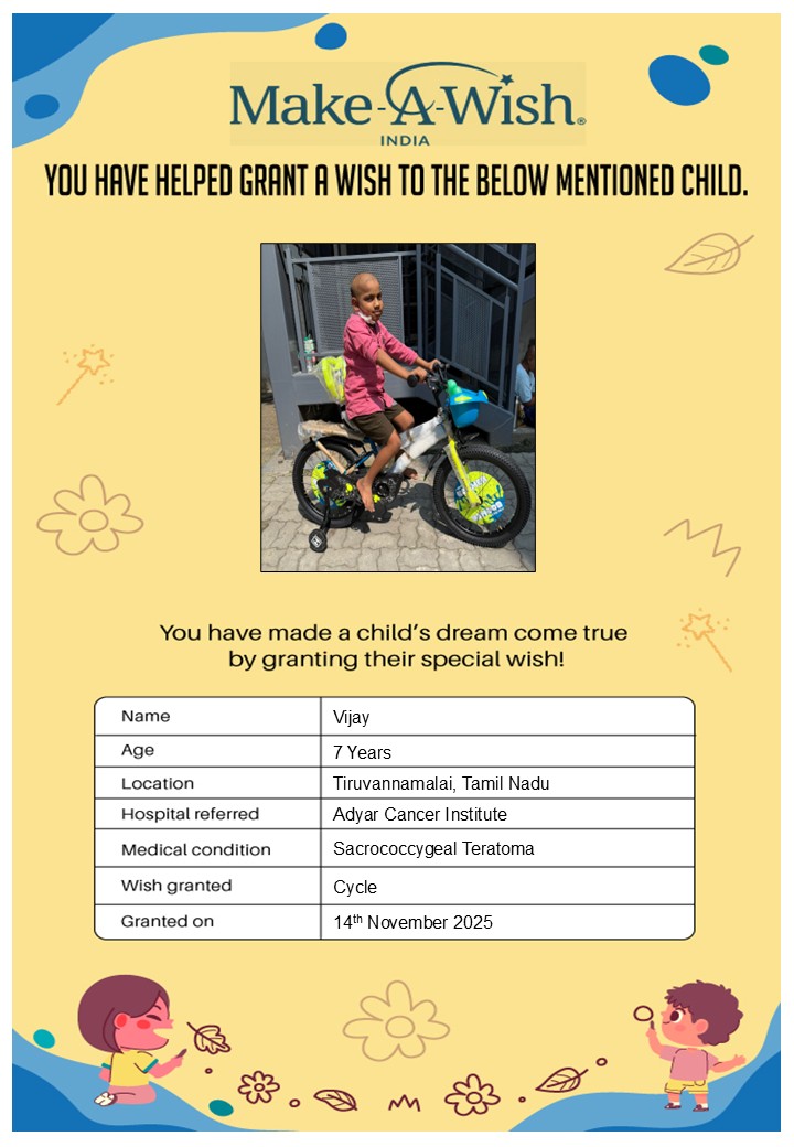 At an average cost of INR 10,000, every wish covers planning, logistics, and the magical experience itself, and by supporting this campaign, you are not just creating smiles but giving children hope, strength, and a better chance of recovery.
