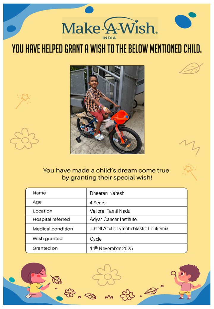 By supporting this campaign, you can help turn a child’s dream into reality, giving them strength, hope, and smiles for a brighter future. Your contribution spreads joy, courage, and inspiration to children in Chennai who need it most and helps them believe in the magic of dreams, even in the toughest times.