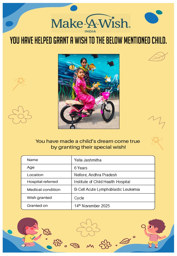 At an average cost of INR 10,000, every wish covers planning, logistics, and the magical experience itself, and by supporting this campaign, you are not just creating smiles but giving children hope, strength, and a better chance of recovery.