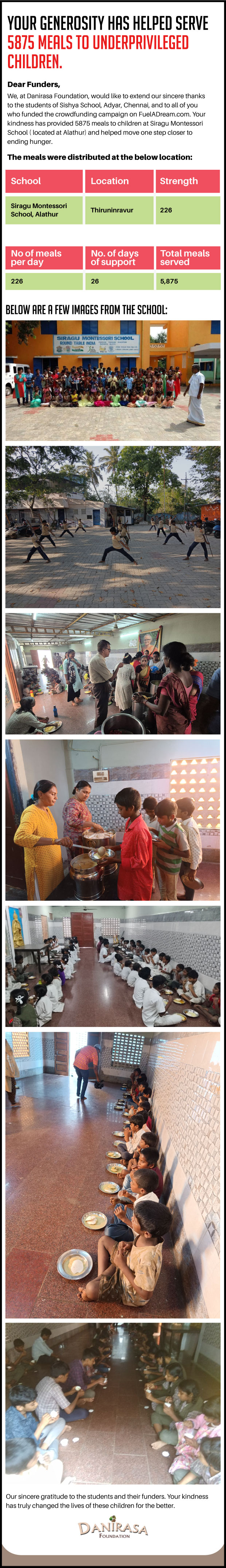 To solve this problem, a Chennai-based NGO, Danirasa Foundation, has been serving nutritious and wholesome meals to children from low-income homes and to the elderly residing in old age homes in Chennai since 2017. The meals are cooked at the Danirasa Kitchen in Thiruninravur (35 km from Adyar, Chennai). The mission is to provide nutritious meals to underserved communities.