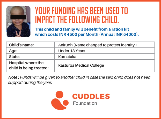 This campaign of mine is being done in partnership with the NGO -Cuddles Foundation and aims to fight hunger and malnutrition in children from low-income homes by giving them a MONTHLY RATION BASKET. This improves their chance of survival by 70% and ultimately does save lives. The baskets are given to children at Mazumdar Shaw Medical Centre, St John's Hospital and Sri Shankara Cancer Foundation in Bengaluru, KLE's Dr. Prabhakar Kore Hospital and Medical Research Centre in Belgaum and Kasturba Medical Hospital in Manipal.