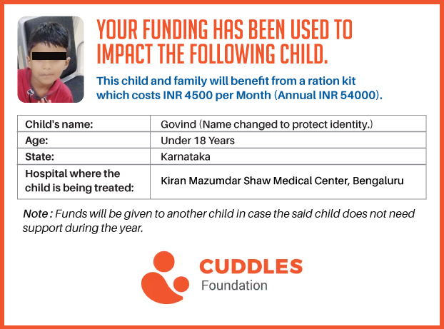 The NGO Cuddles gives the ration kit which helps these kids get the right nutrition and aids them as they fight cancer. The cost to impact a child and the family for a month is just INR 4500.