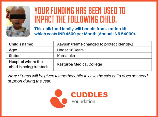 This campaign of mine is being done in partnership with the NGO -Cuddles Foundation and aims to fight hunger and malnutrition in children from low-income homes by giving them a MONTHLY RATION BASKET. This improves their chance of survival by 70% and ultimately does save lives. The baskets are given to children at Mazumdar Shaw Medical Centre, St John's Hospital and Sri Shankara Cancer Foundation in Bengaluru, KLE's Dr. Prabhakar Kore Hospital and Medical Research Centre in Belgaum and Kasturba Medical Hospital in Manipal.