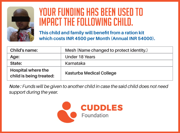 This campaign of mine is being done in partnership with the NGO -Cuddles Foundation and aims to fight hunger and malnutrition in children from low-income homes by giving them a MONTHLY RATION BASKET. This improves their chance of survival by 70% and ultimately does save lives. The baskets are given to children at Mazumdar Shaw Medical Centre, St John's Hospital and Sri Shankara Cancer Foundation in Bengaluru, KLE's Dr. Prabhakar Kore Hospital and Medical Research Centre in Belgaum and Kasturba Medical Hospital in Manipal.