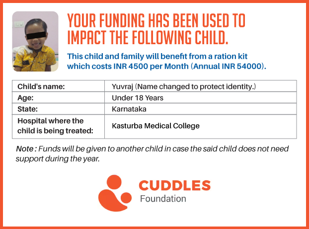 This campaign of mine is being done in partnership with the NGO -Cuddles Foundation and aims to fight hunger and malnutrition in children from low-income homes by giving them a MONTHLY RATION BASKET. This improves their chance of survival by 70% and ultimately does save lives. The baskets are given to children at Mazumdar Shaw Medical Centre, St John's Hospital and Sri Shankara Cancer Foundation in Bengaluru, KLE's Dr. Prabhakar Kore Hospital and Medical Research Centre in Belgaum and Kasturba Medical Hospital in Manipal.
