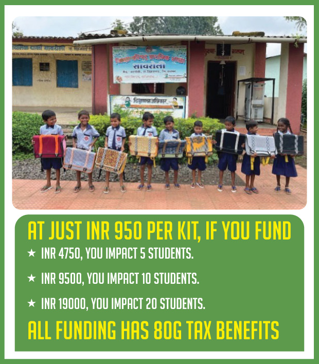 School-going children in many government schools are greatly disadvantaged when they go to school. They walk long distances barefoot, they do not have a proper school bag, and they sit on the floor. All this leads to poor attendance, health issues, and a lack of interest in studies (as their sitting posture itself is very uncomfortable).