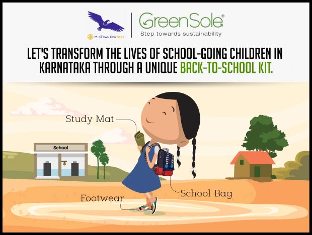 Members of Rotary Bangalore Midtown GenNext (RBMGN) are doing this campaign for the Greensole Foundation to support the education of children in Karnataka through this unique back-to-school kit.
