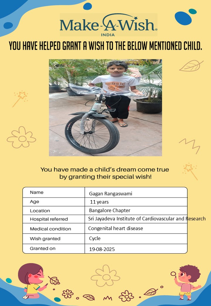 I am doing this campaign in partnership with the NGO Make-A-Wish India. This will impact children from low-income homes at the following partner hospitals in Bengaluru: Indira Gandhi Institute of Child Health, Rainbow Children's Hospital, Sri Jayadeva Institute of Cardiovascular Sciences and Research and St John's Medical College Hospital.
