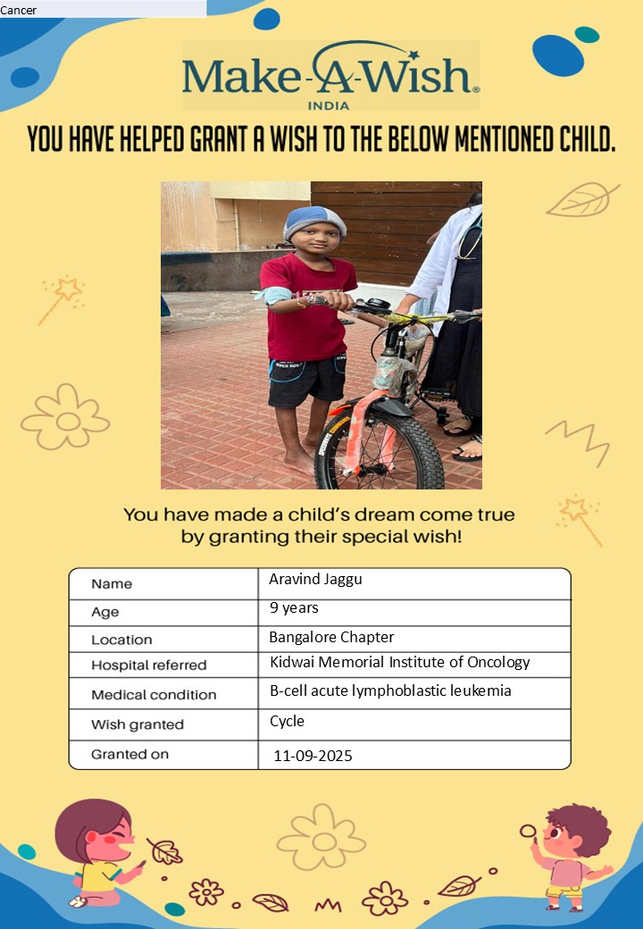 By supporting this campaign, you can help turn a child’s dream into reality, giving them strength, hope, and smiles for a brighter future. Your contribution spreads joy, courage, and inspiration to children in Bengaluru who need it most and helps them believe in the magic of dreams, even in the toughest times.
