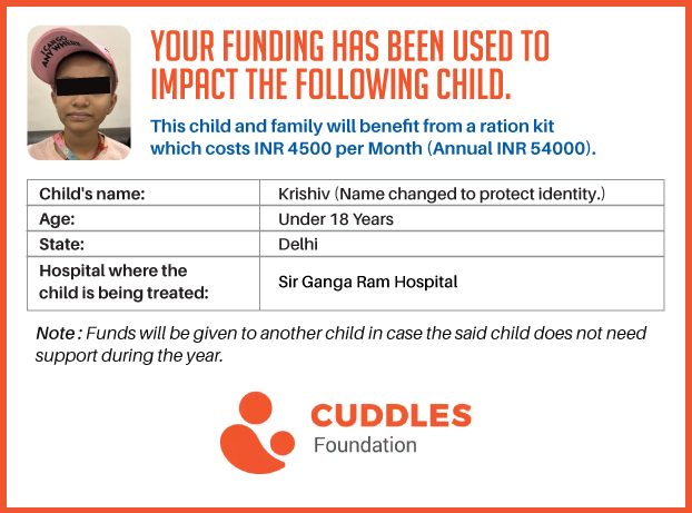I have undertaken this campaign because this is a critical element in the treatment of these children who go through the difficult journey of fighting cancer. Although there are several people and organizations that sponsor the treatment of financially stressed patients, there are very few that help out with an equally important issue - "THEIR FOOD AND NUTRITION".