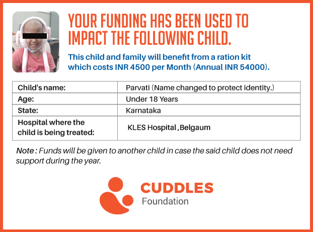 This campaign of mine is being done in partnership with the NGO -Cuddles Foundation and aims to fight hunger and malnutrition in children from low-income homes by giving them a MONTHLY RATION BASKET. This improves their chance of survival by 70% and ultimately does save lives. The baskets are given to children at Mazumdar Shaw Medical Centre, St John's Hospital and Sri Shankara Cancer Foundation in Bengaluru, KLE's Dr. Prabhakar Kore Hospital and Medical Research Centre in Belgaum and Kasturba Medical Hospital in Manipal.