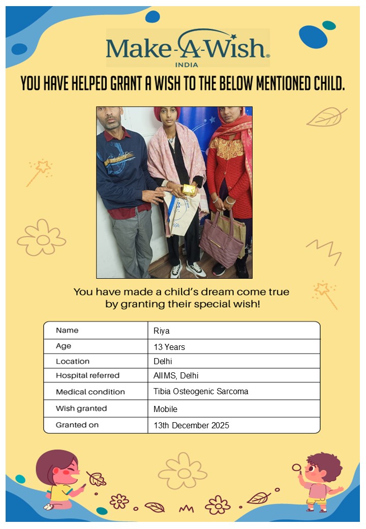 At an average cost of INR 10,000, every wish covers planning, logistics, and the magical experience itself, and by supporting this campaign, you are not just creating smiles but giving children hope, strength, and a better chance of recovery.