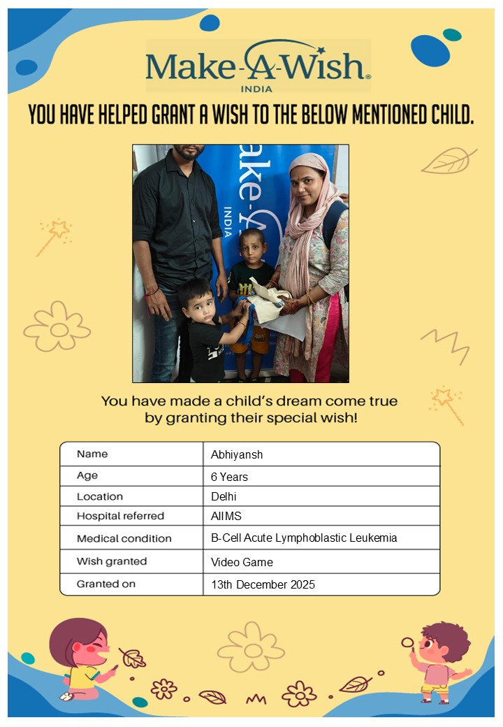 At an average cost of INR 10,000, every wish covers planning, logistics, and the magical experience itself, and by supporting this campaign, you are not just creating smiles but giving children hope, strength, and a better chance of recovery.
