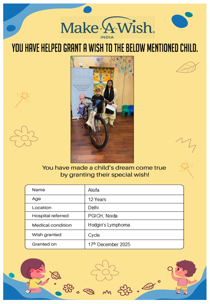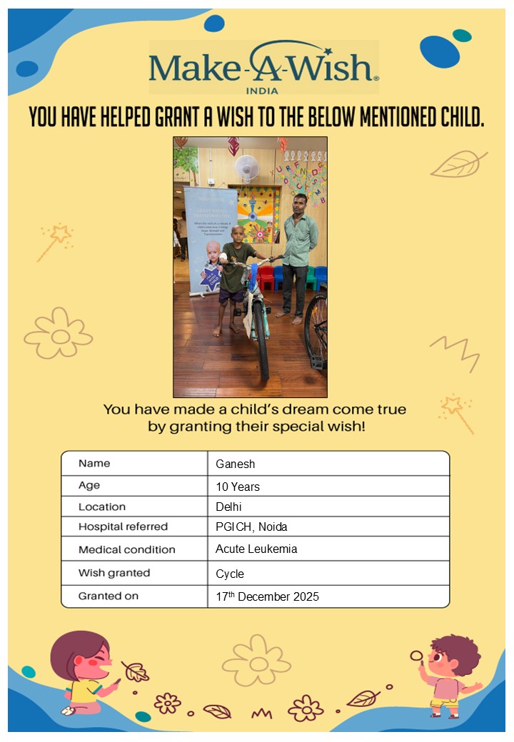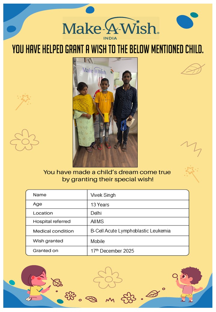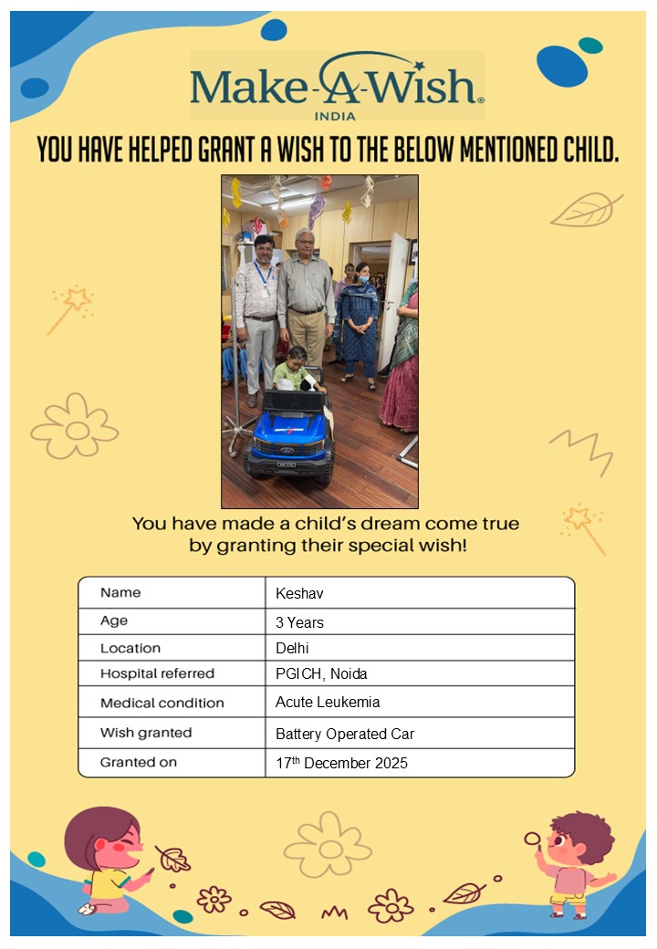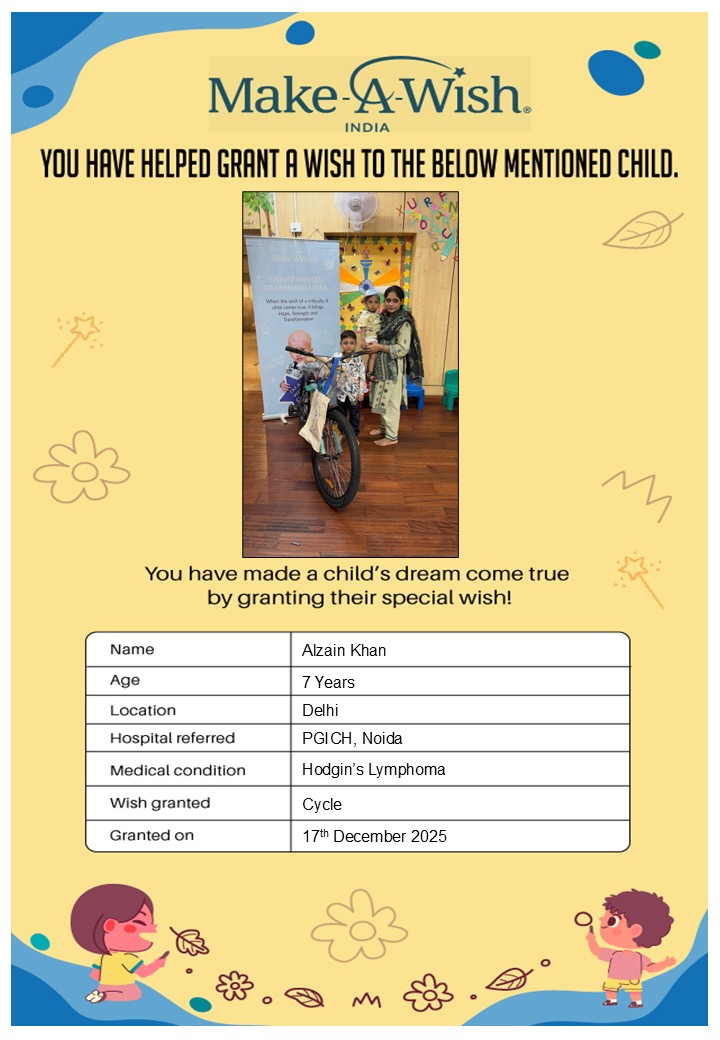 At an average cost of INR 10,000, every wish covers planning, logistics, and the magical experience itself, and by supporting this campaign, you are not just creating smiles but giving children hope, strength, and a better chance of recovery.