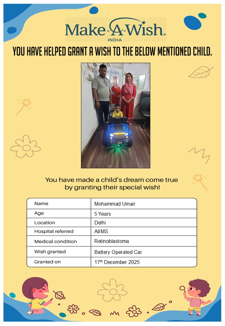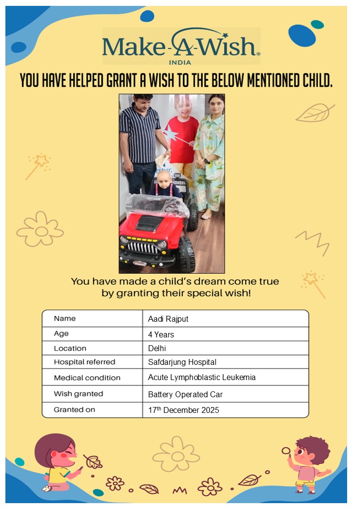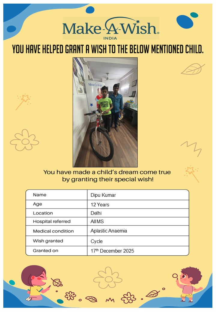 At an average cost of INR 10,000, every wish covers planning, logistics, and the magical experience itself, and by supporting this campaign, you are not just creating smiles but giving children hope, strength, and a better chance of recovery.