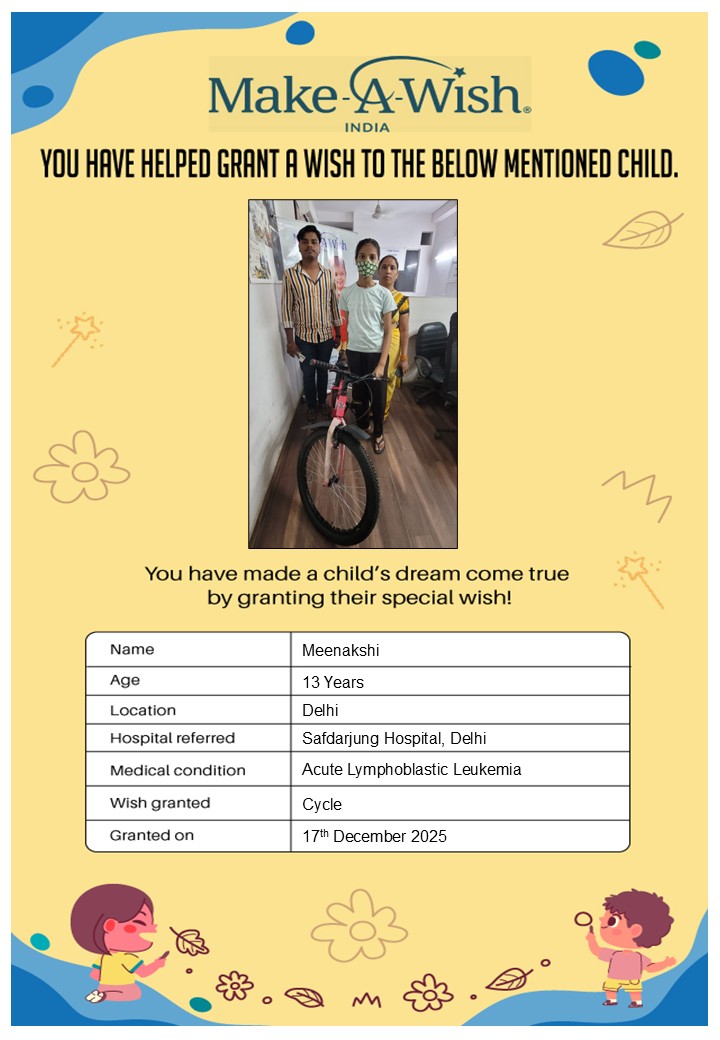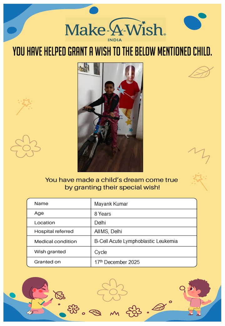 At an average cost of INR 10,000, every wish covers planning, logistics, and the magical experience itself, and by supporting this campaign, you are not just creating smiles but giving children hope, strength, and a better chance of recovery.