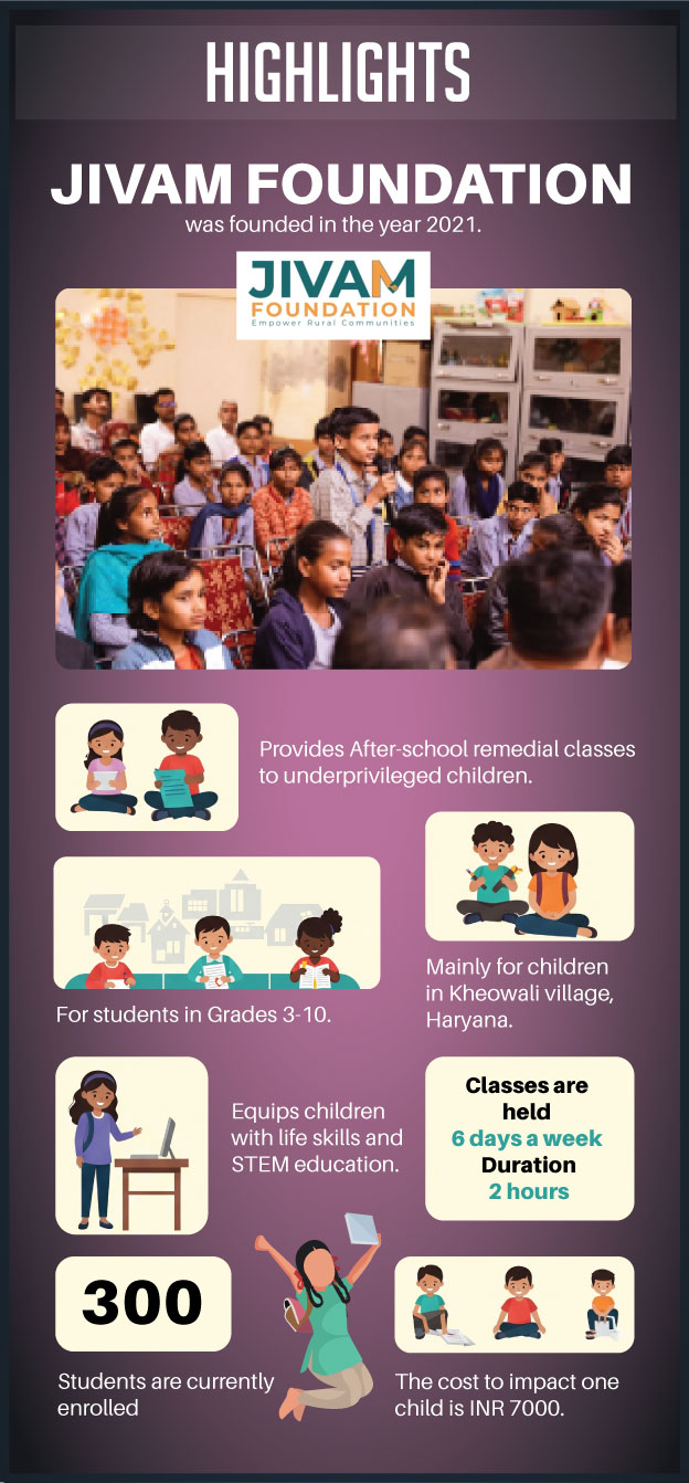 JIVAM Foundation was founded in September 2020 by Isha Godara, a finance graduate and management consultant who returned to her ancestral village during the pandemic. Disturbed by the sight of children cut off from learning, she began teaching a handful of them in her backyard. That spark soon ignited a movement. Today, JIVAM Foundation operates a full-fledged Learning and Leadership Centre in Kheowali village, Sirsa, Haryana.