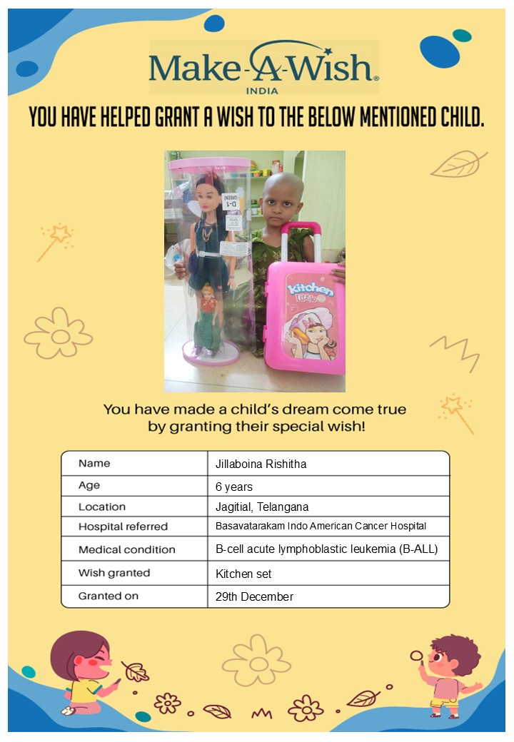 By supporting this campaign, you can help turn a child’s dream into reality, giving them strength, hope, and smiles for a brighter future. Your contribution spreads joy, courage, and inspiration to children in Hyderabad who need it most and helps them believe in the magic of dreams, even in the toughest times.