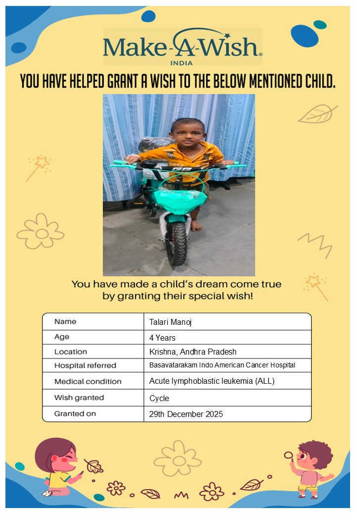 At an average cost of INR 10,000, every wish covers planning, logistics, and the magical experience itself, and by supporting this campaign, you are not just creating smiles but giving children hope, strength, and a better chance of recovery.