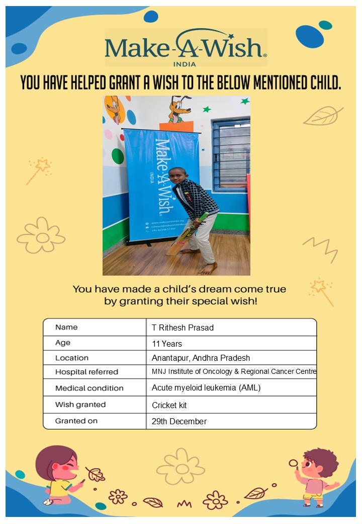 At an average cost of INR 10,000, every wish covers planning, logistics, and the magical experience itself, and by supporting this campaign, you are not just creating smiles but giving children hope, strength, and a better chance of recovery.
