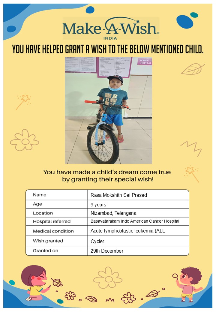 By supporting this campaign, you can help turn a child’s dream into reality, giving them strength, hope, and smiles for a brighter future. Your contribution spreads joy, courage, and inspiration to children in Hyderabad who need it most and helps them believe in the magic of dreams, even in the toughest times.