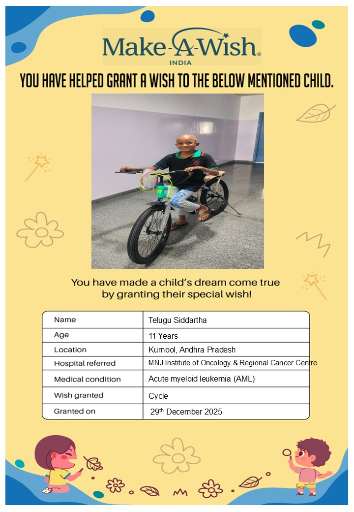 At an average cost of INR 10,000, every wish covers planning, logistics, and the magical experience itself, and by supporting this campaign, you are not just creating smiles but giving children hope, strength, and a better chance of recovery.