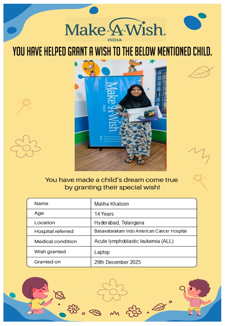 By supporting this campaign, you can help turn a child’s dream into reality, giving them strength, hope, and smiles for a brighter future. Your contribution spreads joy, courage, and inspiration to children in Hyderabad who need it most and helps them believe in the magic of dreams, even in the toughest times.