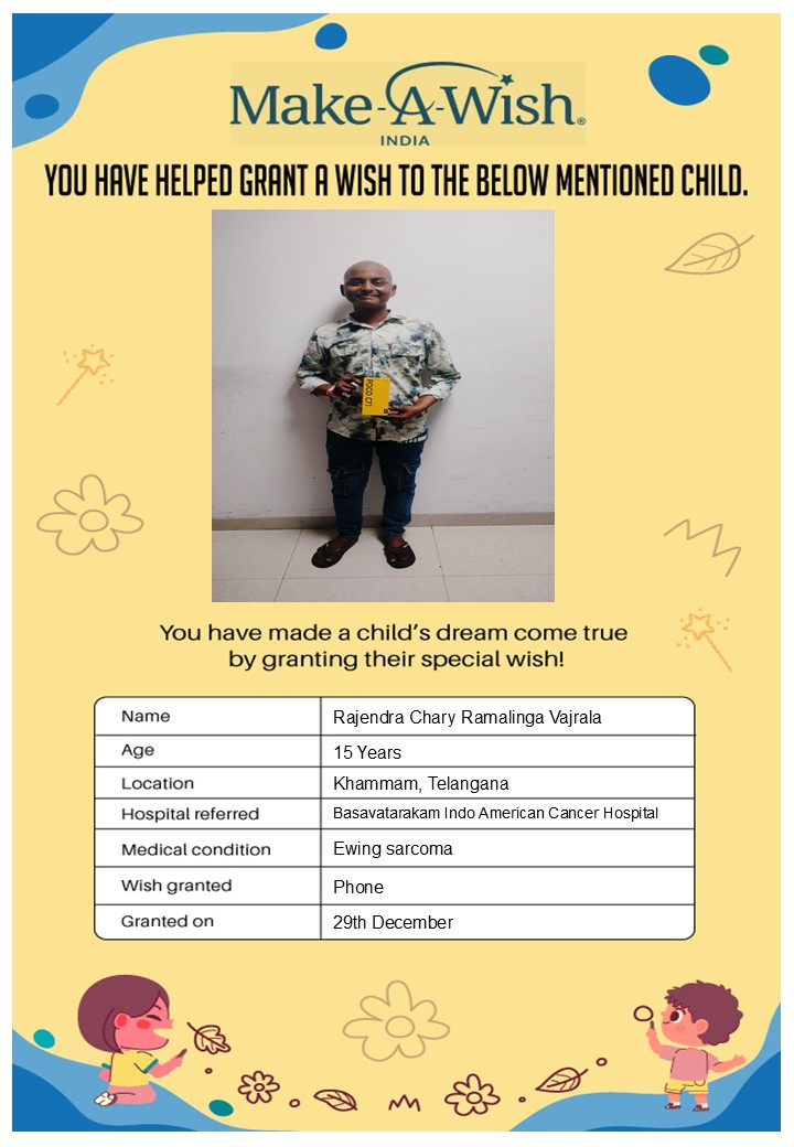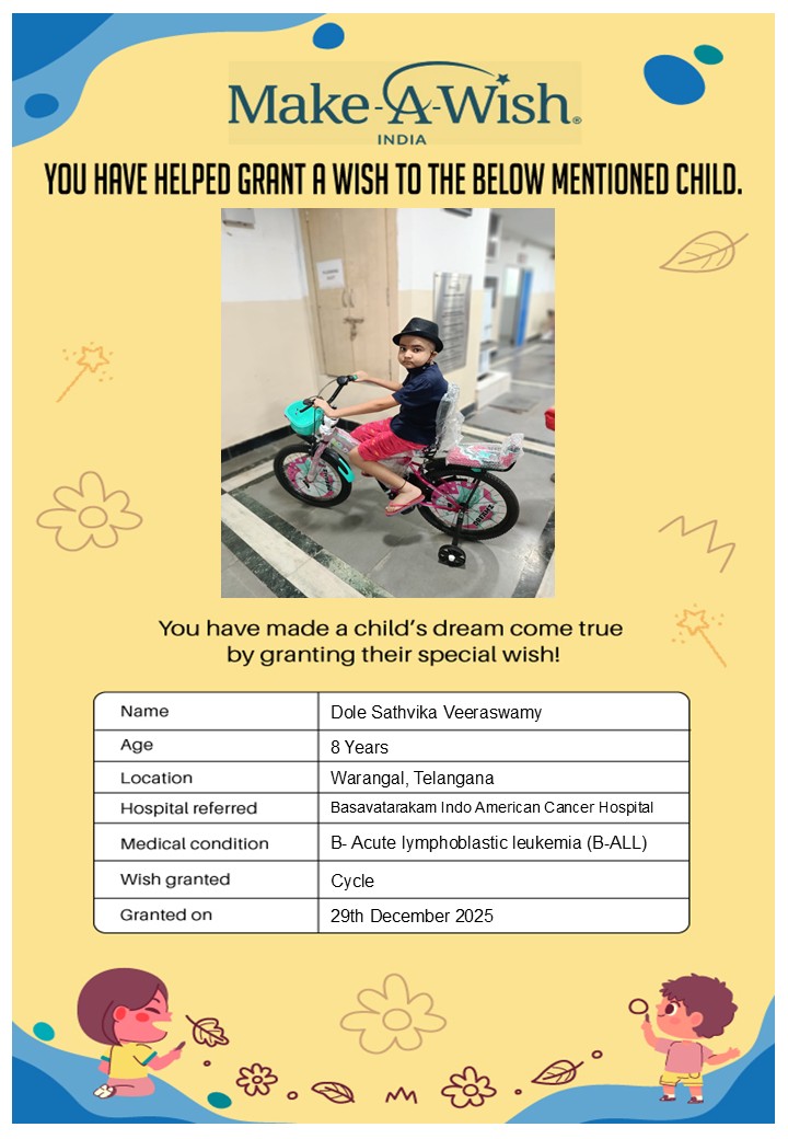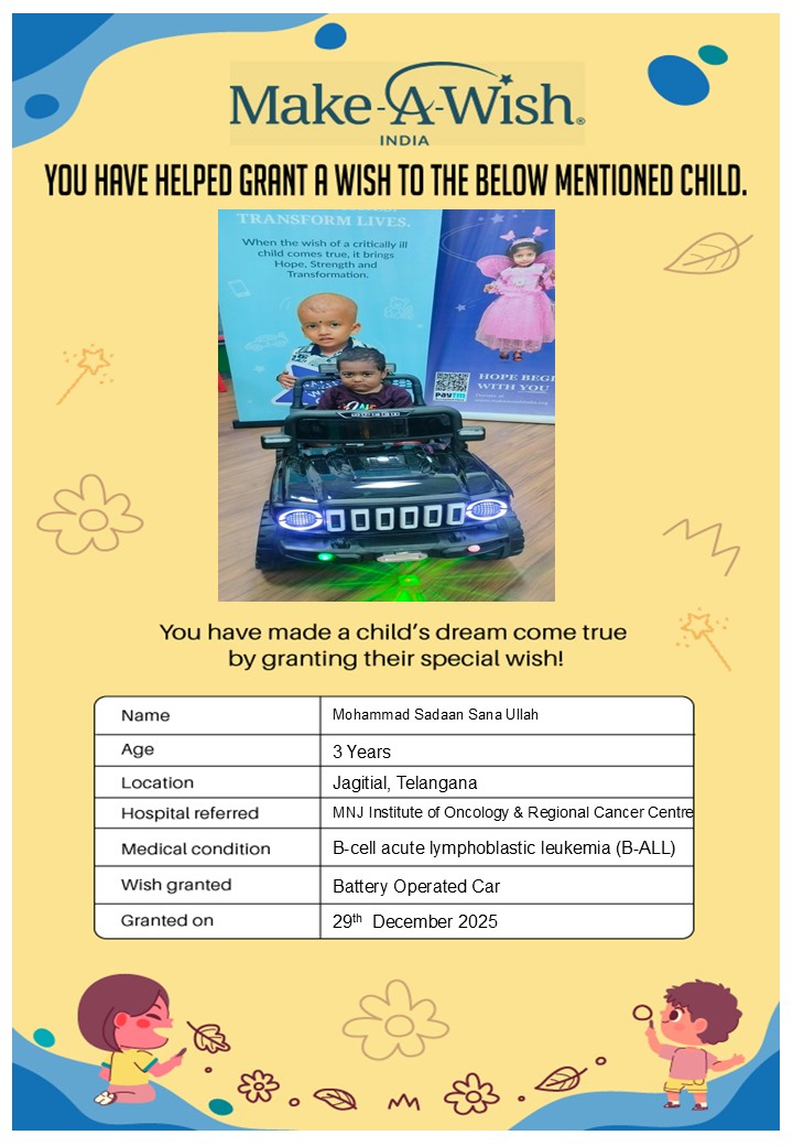 By supporting this campaign, you can help turn a child’s dream into reality, giving them strength, hope, and smiles for a brighter future. Your contribution spreads joy, courage, and inspiration to children in Hyderabad who need it most and helps them believe in the magic of dreams, even in the toughest times.