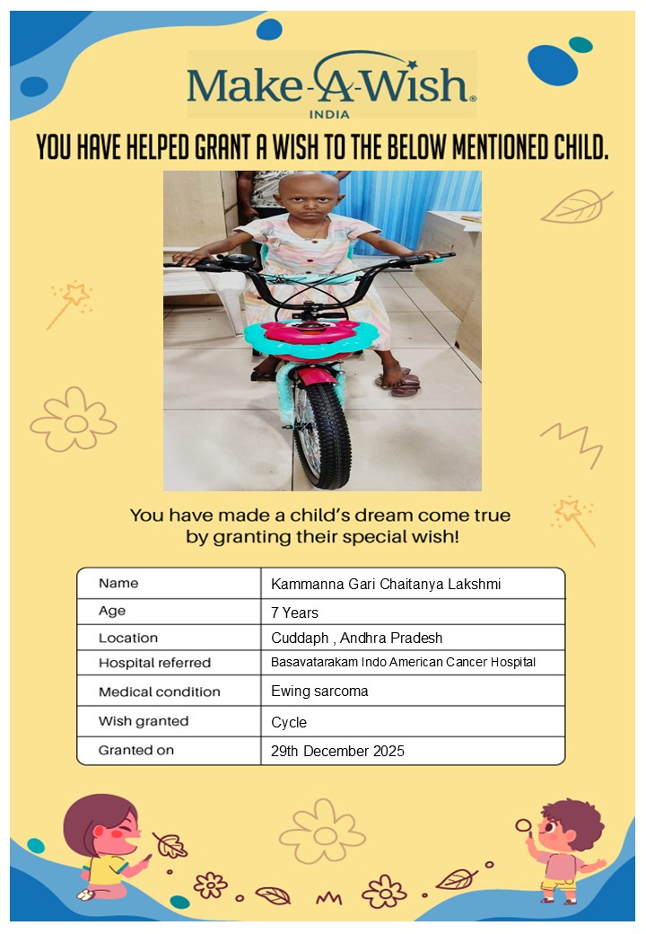 At an average cost of INR 10,000, every wish covers planning, logistics, and the magical experience itself, and by supporting this campaign, you are not just creating smiles but giving children hope, strength, and a better chance of recovery.