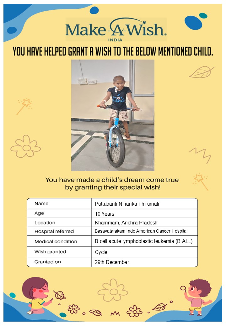 By supporting this campaign, you can help turn a child’s dream into reality, giving them strength, hope, and smiles for a brighter future. Your contribution spreads joy, courage, and inspiration to children in Hyderabad who need it most and helps them believe in the magic of dreams, even in the toughest times.
