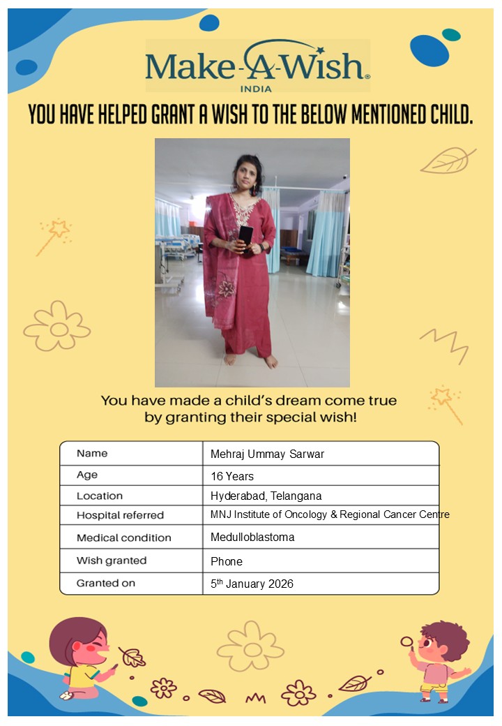 By supporting this campaign, you can help turn a child’s dream into reality, giving them strength, hope, and smiles for a brighter future. Your contribution spreads joy, courage, and inspiration to children in Hyderabad who need it most and helps them believe in the magic of dreams, even in the toughest times.
