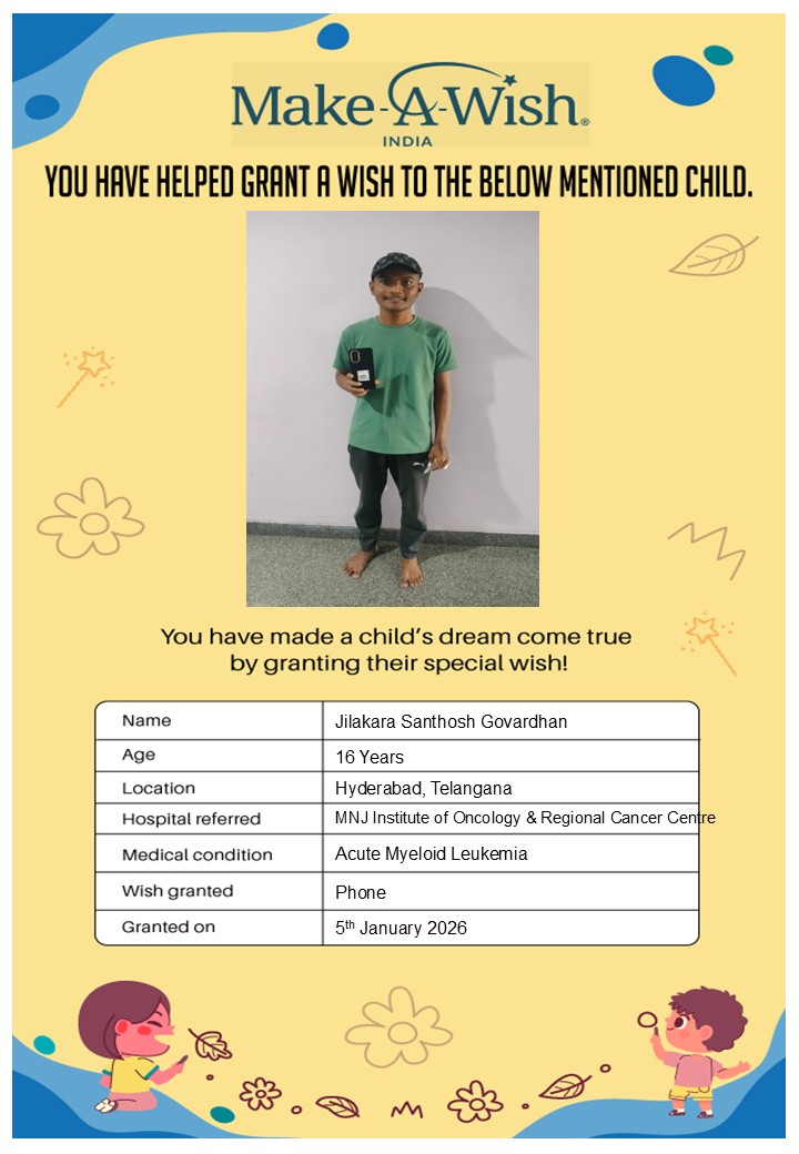 At an average cost of INR 10,000, every wish covers planning, logistics, and the magical experience itself, and by supporting this campaign, you are not just creating smiles but giving children hope, strength, and a better chance of recovery.