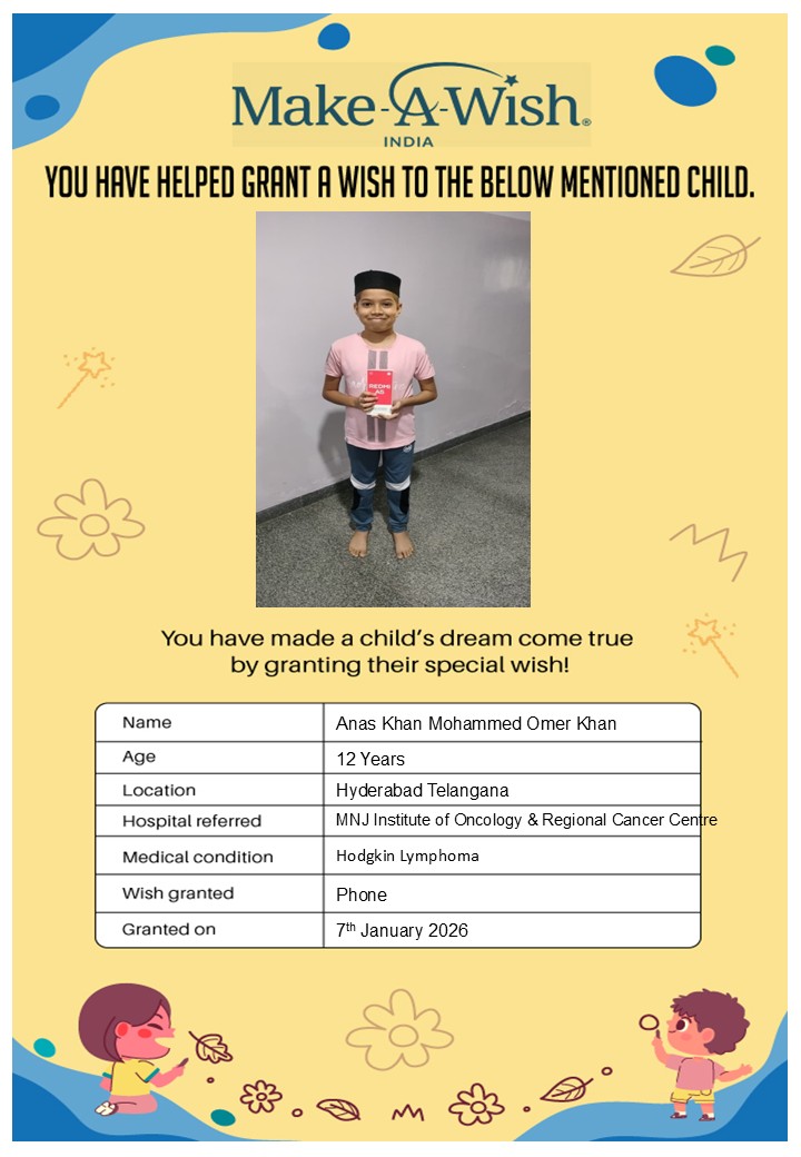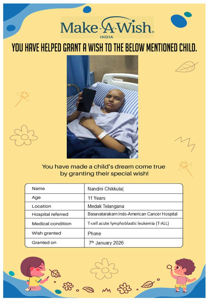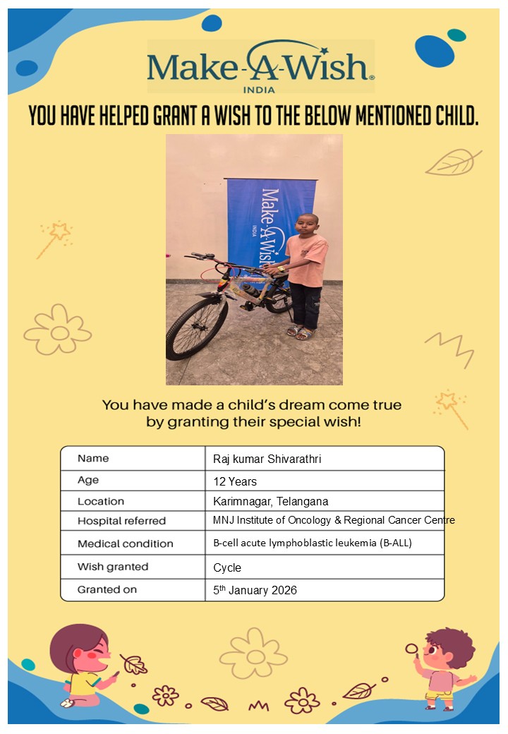 By supporting this campaign, you can help turn a child’s dream into reality, giving them strength, hope, and smiles for a brighter future. Your contribution spreads joy, courage, and inspiration to children in Hyderabad who need it most and helps them believe in the magic of dreams, even in the toughest times.