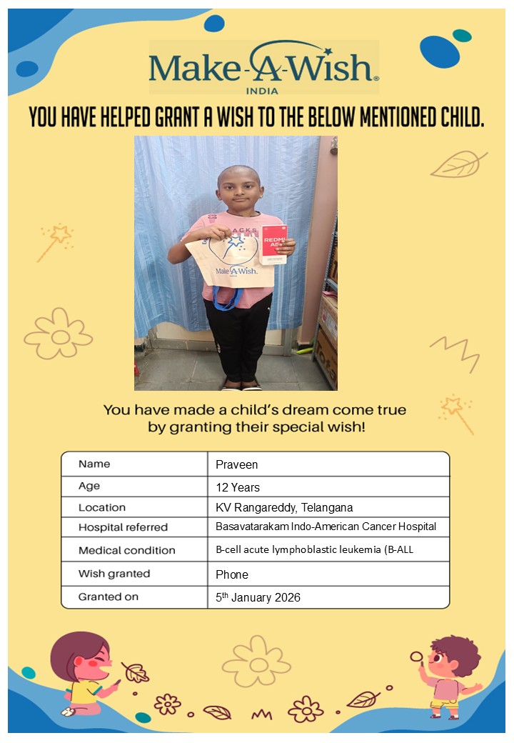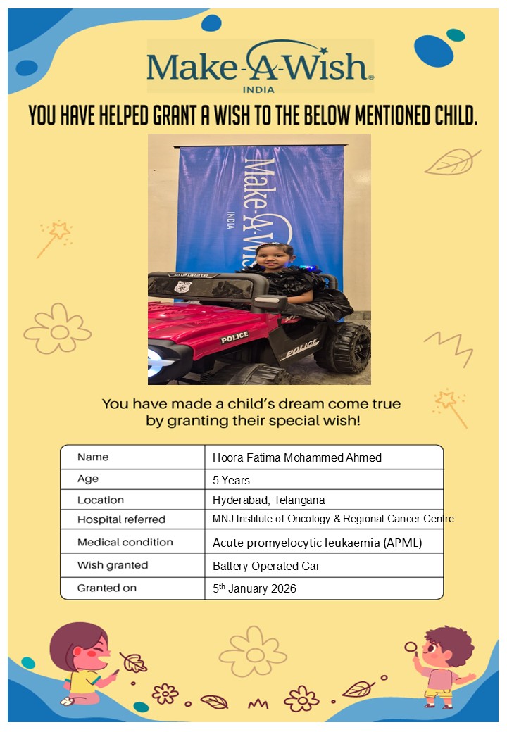 By supporting this campaign, you can help turn a child’s dream into reality, giving them strength, hope, and smiles for a brighter future. Your contribution spreads joy, courage, and inspiration to children in Hyderabad who need it most and helps them believe in the magic of dreams, even in the toughest times.