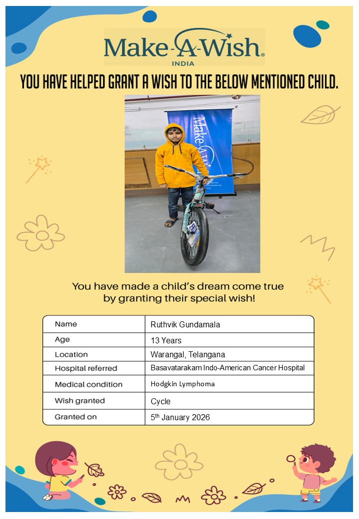 By supporting this campaign, you can help turn a child’s dream into reality, giving them strength, hope, and smiles for a brighter future. Your contribution spreads joy, courage, and inspiration to children in Hyderabad who need it most and helps them believe in the magic of dreams, even in the toughest times.